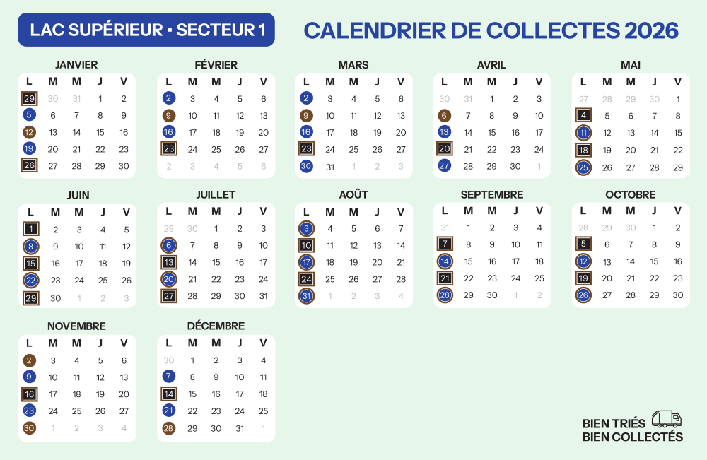 Calendrier de collecte Lac-Supérieur, secteur 1 : Districts 01 et 02 incluant le lac Quenouille Changer de secteur Prochaines collectes Calendrier 2025 ↓ Calendrier 2026 ↓ Bac vert Bac noir Bac brun Télécharger le calendrier complet en format PDF Télécharger le calendrier complet en format PDF