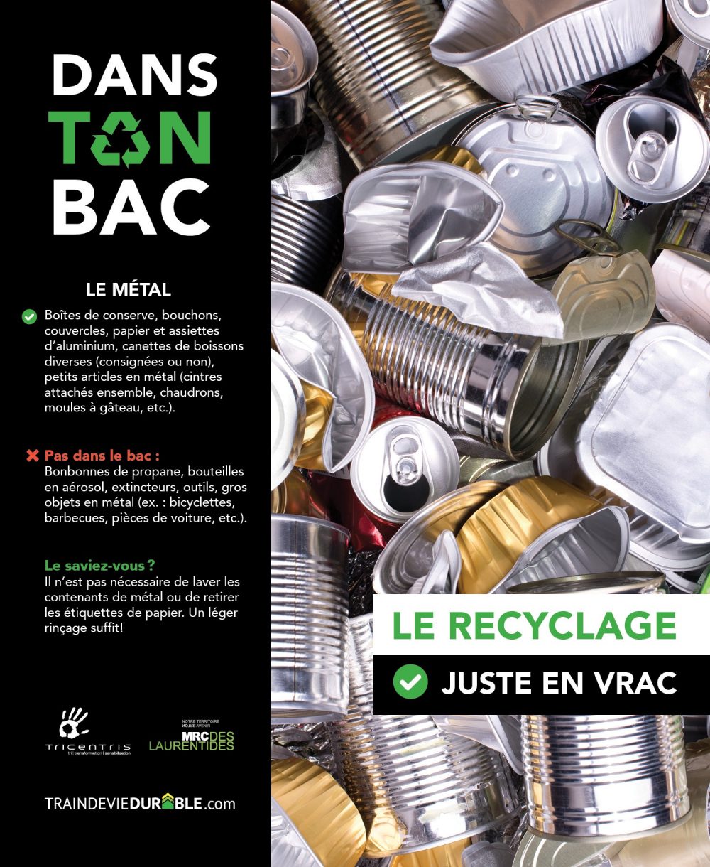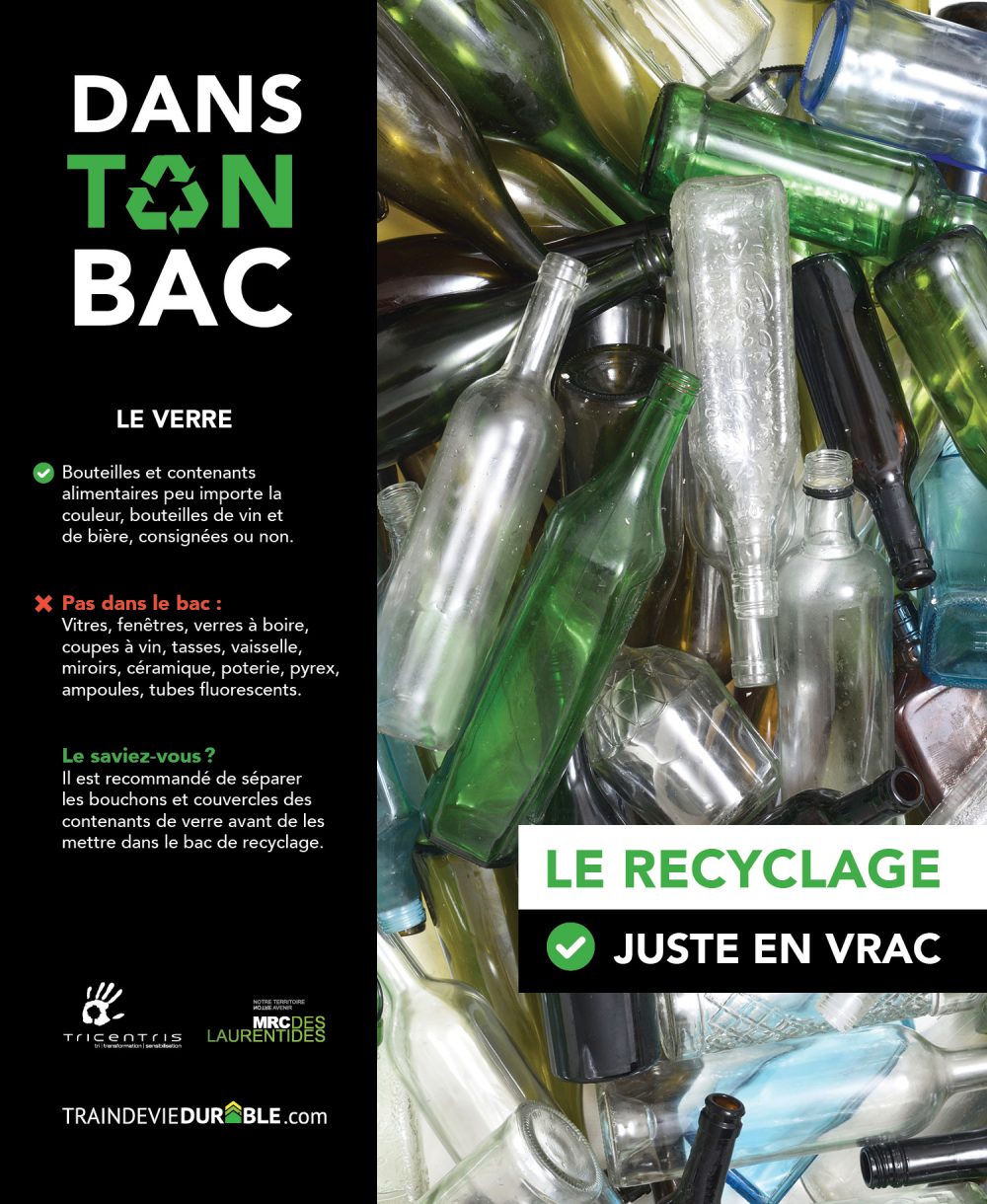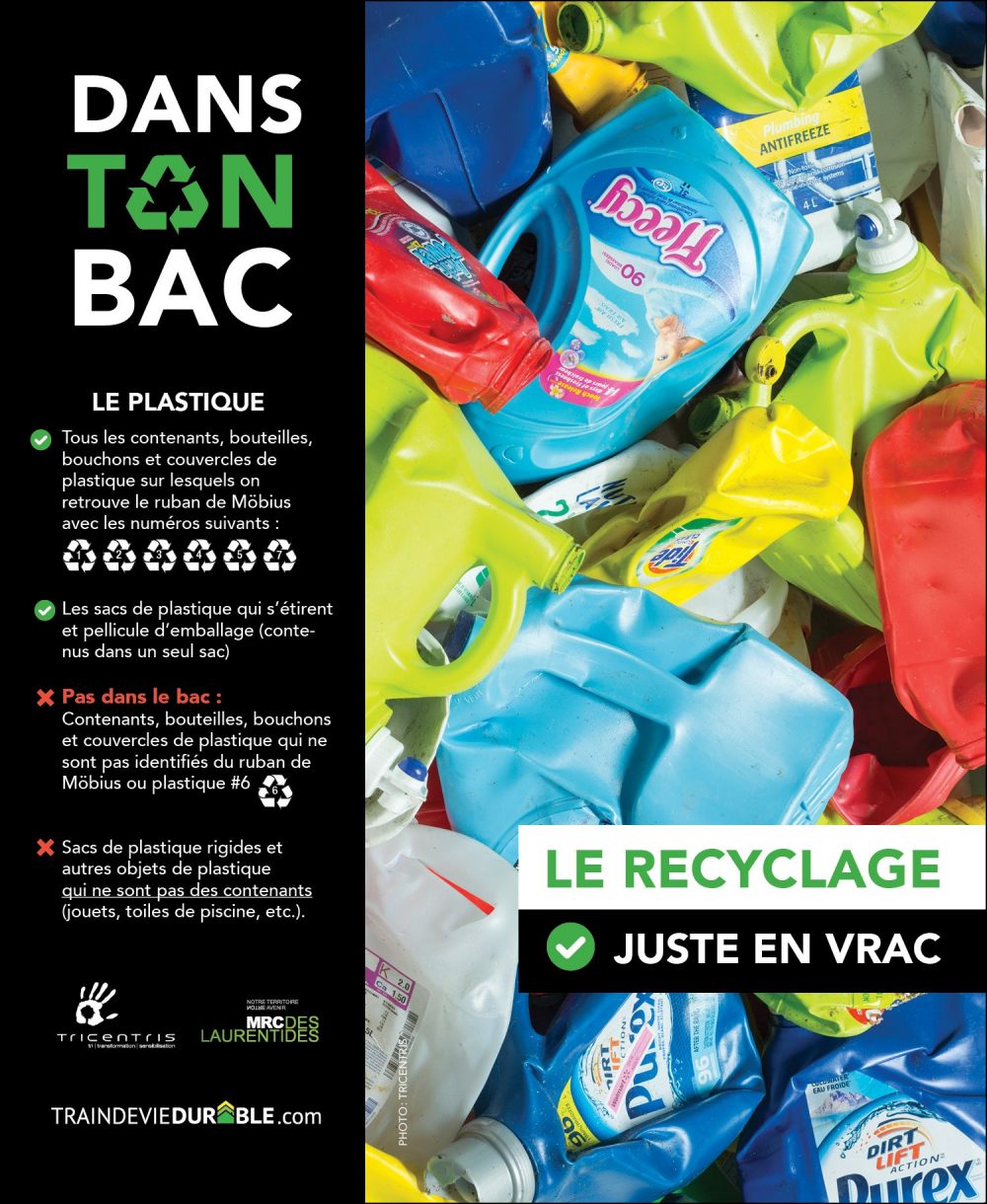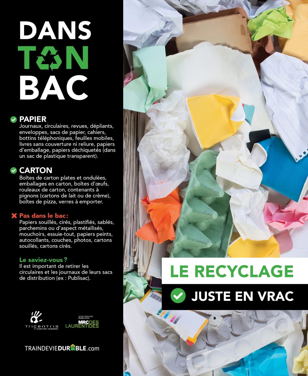 Le saviez-vous? Il n’est pas recommandé de mettre vos matières recyclables dans un sac de plastique avant de les mettre au bac vert. En les mettant en vrac dans le bac, vous réduisez votre consommation de sacs de plastique à usage unique, diminuez votre impact sur l’environnement et facilitez le travail des employés du centre de tri des matières résiduelles! Pour plus d’informations sur la gestion des matières résiduelles, visitez le www.traindeviedurable.com.