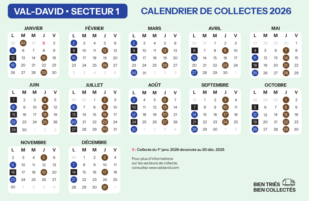 Calendrier de collecte Val-David secteur 1 Changer de secteur Prochaines collectes Calendrier 2025 ↓ Calendrier 2026 ↓ Bac vert Bac noir Bac brun / Secteur 1 Télécharger le calendrier complet en format PDF Télécharger le calendrier complet en format PDF