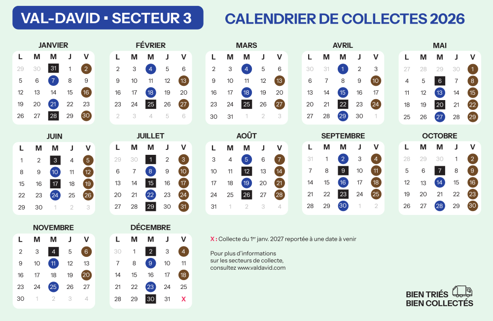 Calendrier de collecte Val-David secteur 3 Changer de secteur Prochaines collectes Calendrier 2025 ↓ Calendrier 2026 ↓ Bac vert Bac noir Bac brun / Secteur 3 Télécharger le calendrier complet en format PDF Télécharger le calendrier complet en format PDF
