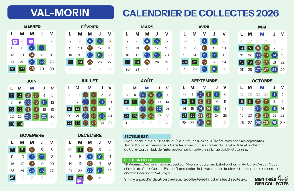Calendrier de collecte Val-Morin ouest Changer de secteur Prochainescollectes Calendrier 2025 ↓ Calendrier 2026 ↓ Bac bleu Bac noir Bac brun / Secteur ouest Télécharger le calendrier complet en format PDF Télécharger le calendrier complet en format PDF